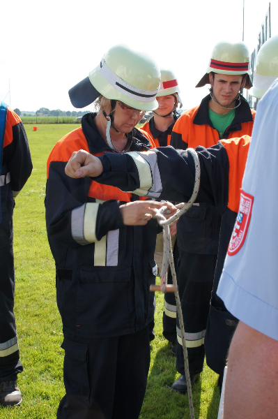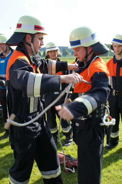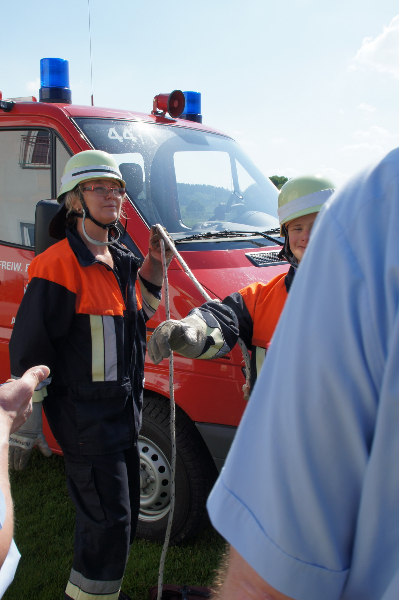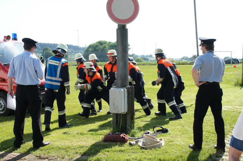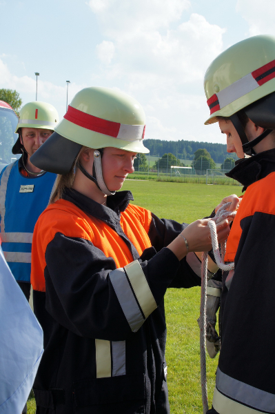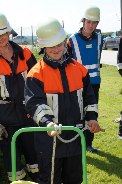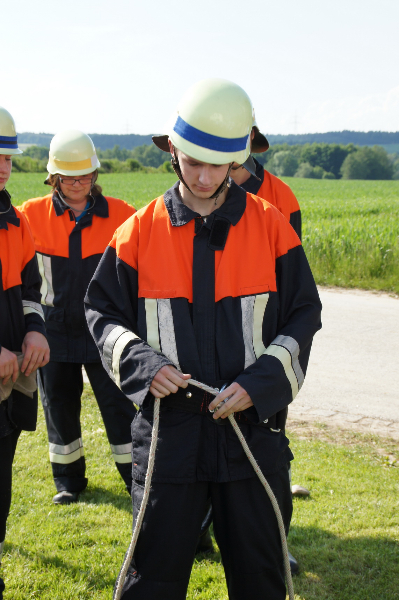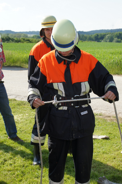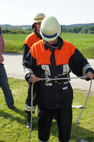 Kreisbrandinspektor Dionys Härtl kam mit KBM Max Schraufnagel und dem Kommandanten aus Prunn, Christian Greiner, als Schiedsrichterteam nach Aufhausen um die Prüfung abzunehmen. Beide Gruppen arbeiteten sauber und im vorgegebenen Zeitfenster. Nur ein paar kleine Flüchtigkeitsfehler bei den Knoten haben sich eingeschlichen. Ansonsten waren beide Gruppen fehlerfrei.