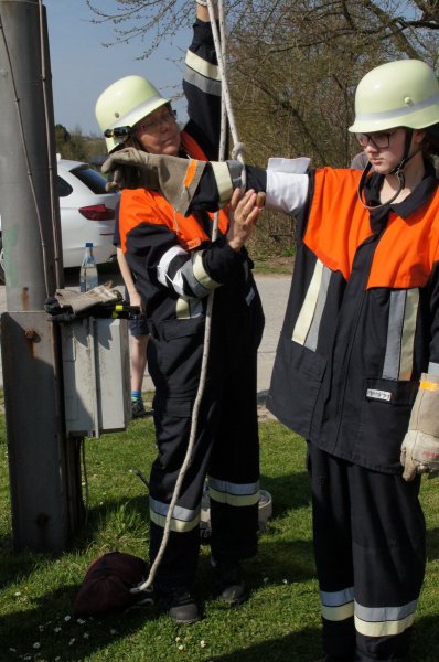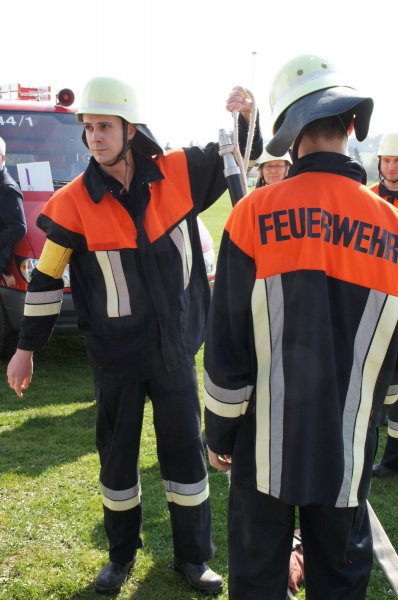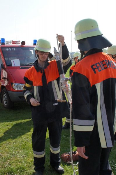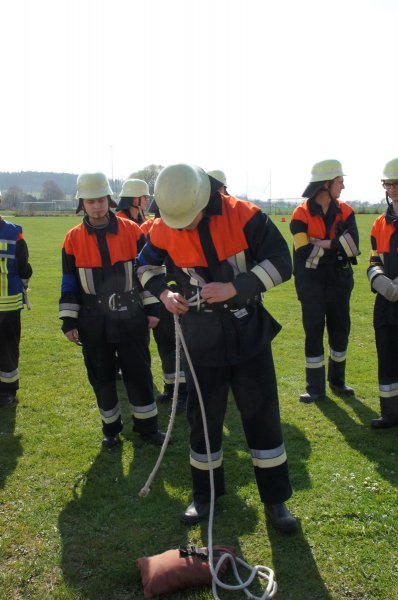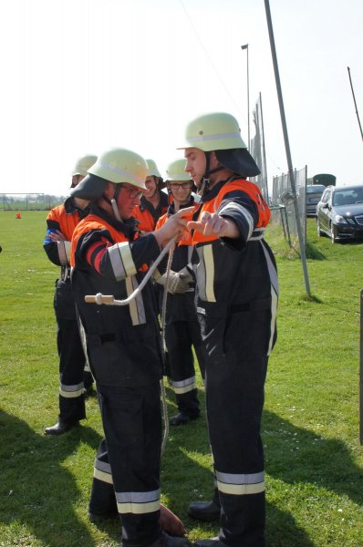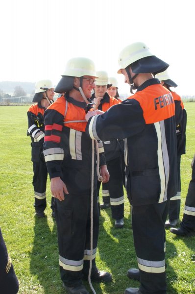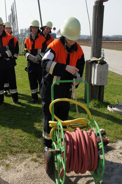 Zuerst wurden die Knoten und Stiche sowie die Zusatzaufgaben geprüft. Sodann ging es an den Aufbau der Löschleitungen. Zu guter Letzt wurde die Saugleitung gekuppelt und die Trockensaugprobe durchgeführt.