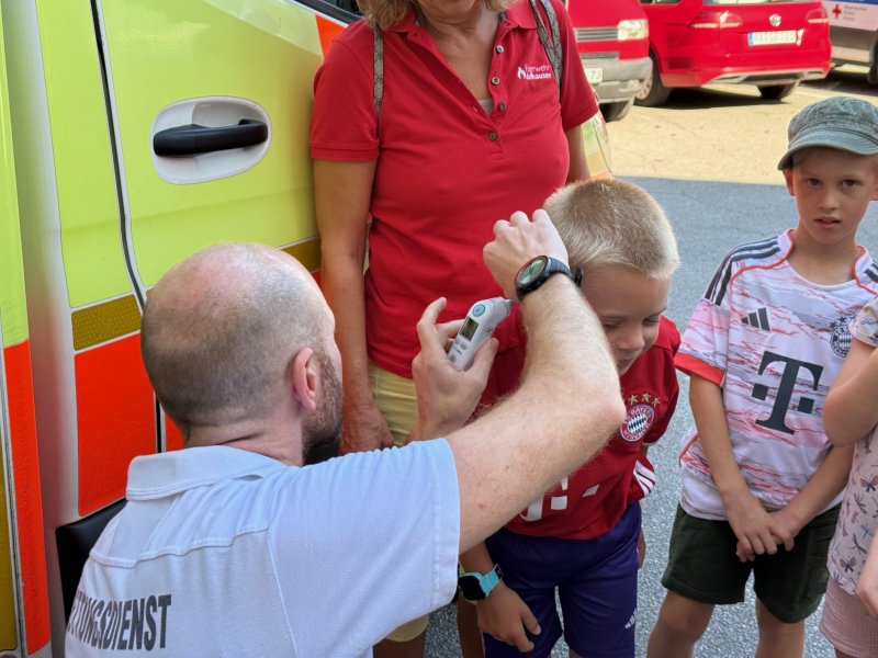 Besonders spannend wurde es, als die Kinder selbst ausprobieren durften, wie Puls und Sauerstoffsättigung gemessen werden – und wie sich diese Werte verändern, wenn man ein paar Runden auf dem Hof läuft. Auch ein tragbares EKG wurde demonstriert, und bei der Vorsitzenden sowie dem Kommandanten wurde gezeigt, wie man mit einem kleinen Fingerpiks den Blutzucker misst.