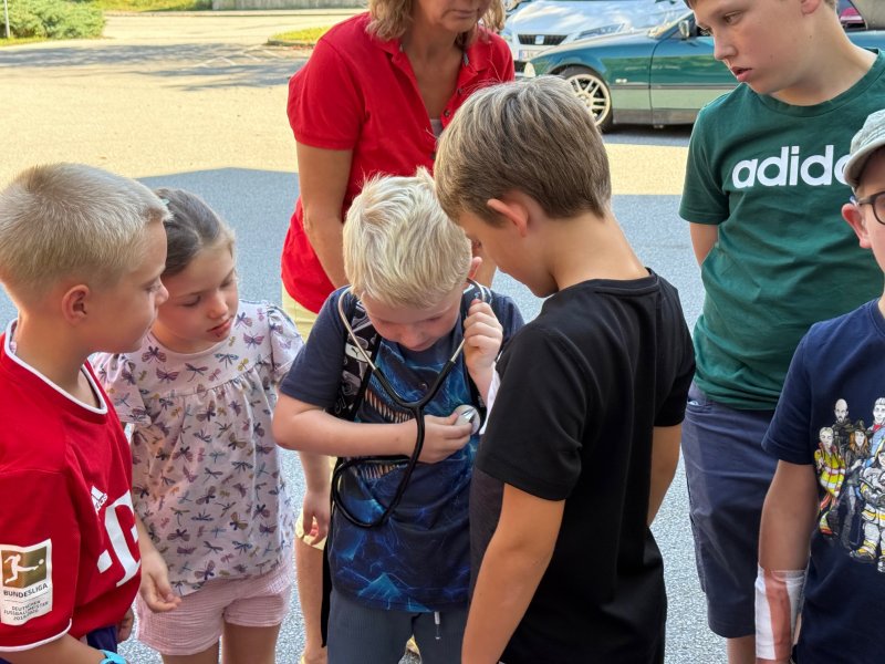 Besonders spannend wurde es, als die Kinder selbst ausprobieren durften, wie Puls und Sauerstoffsättigung gemessen werden – und wie sich diese Werte verändern, wenn man ein paar Runden auf dem Hof läuft. Auch ein tragbares EKG wurde demonstriert, und bei der Vorsitzenden sowie dem Kommandanten wurde gezeigt, wie man mit einem kleinen Fingerpiks den Blutzucker misst.