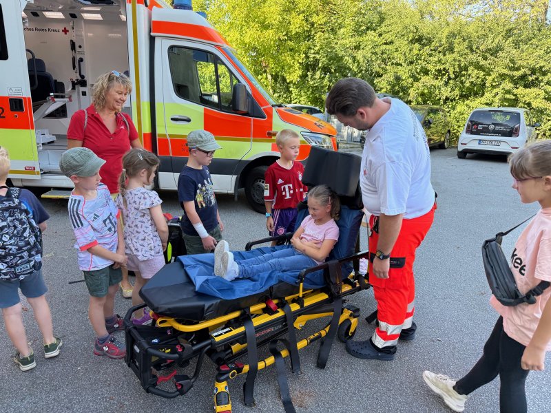 Natürlich durfte auch das Probeliegen auf den fahrbaren Tragen nicht fehlen. Mit viel Staunen verfolgten die Kinder, wie schnell man damit in den Rettungswagen verladen werden kann. Rettungssanitäter Markus erklärte geduldig jedes Detail und beantwortete die neugierigen Fragen der Kinder.