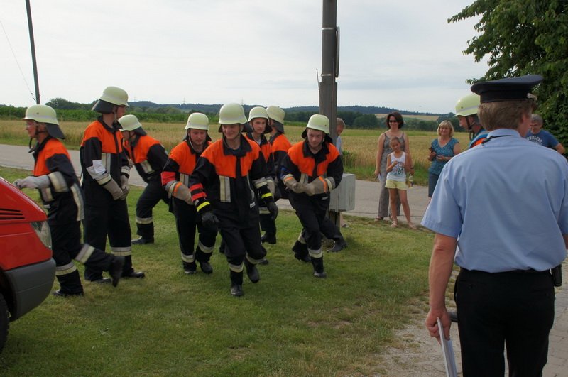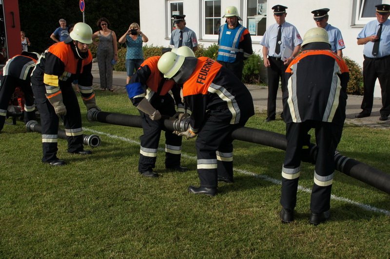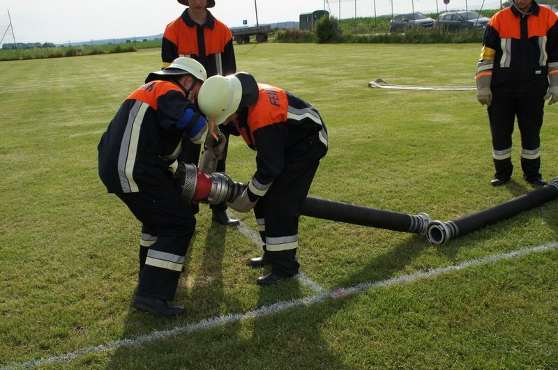 Nach der Auslosung der Positionen wurden die Knoten und Stiche sowie die Zusatzaufgaben geprüft. Sodann ging es an das Aufbauen der Strahlrohrstrecke vom Oberflurhydranten aus. Da dies im Erfolgreich erledigt wurde, war als letzter Prüfungspunkt noch das Kuppeln der Saugleitung zu erledigen und die Trockensaugprobe durchzuführen. Auch hier zeigte sich die Löschgruppe erfolgreich, sodass KBI Härtl zur bestandenen Prüfung gratulieren konnte.